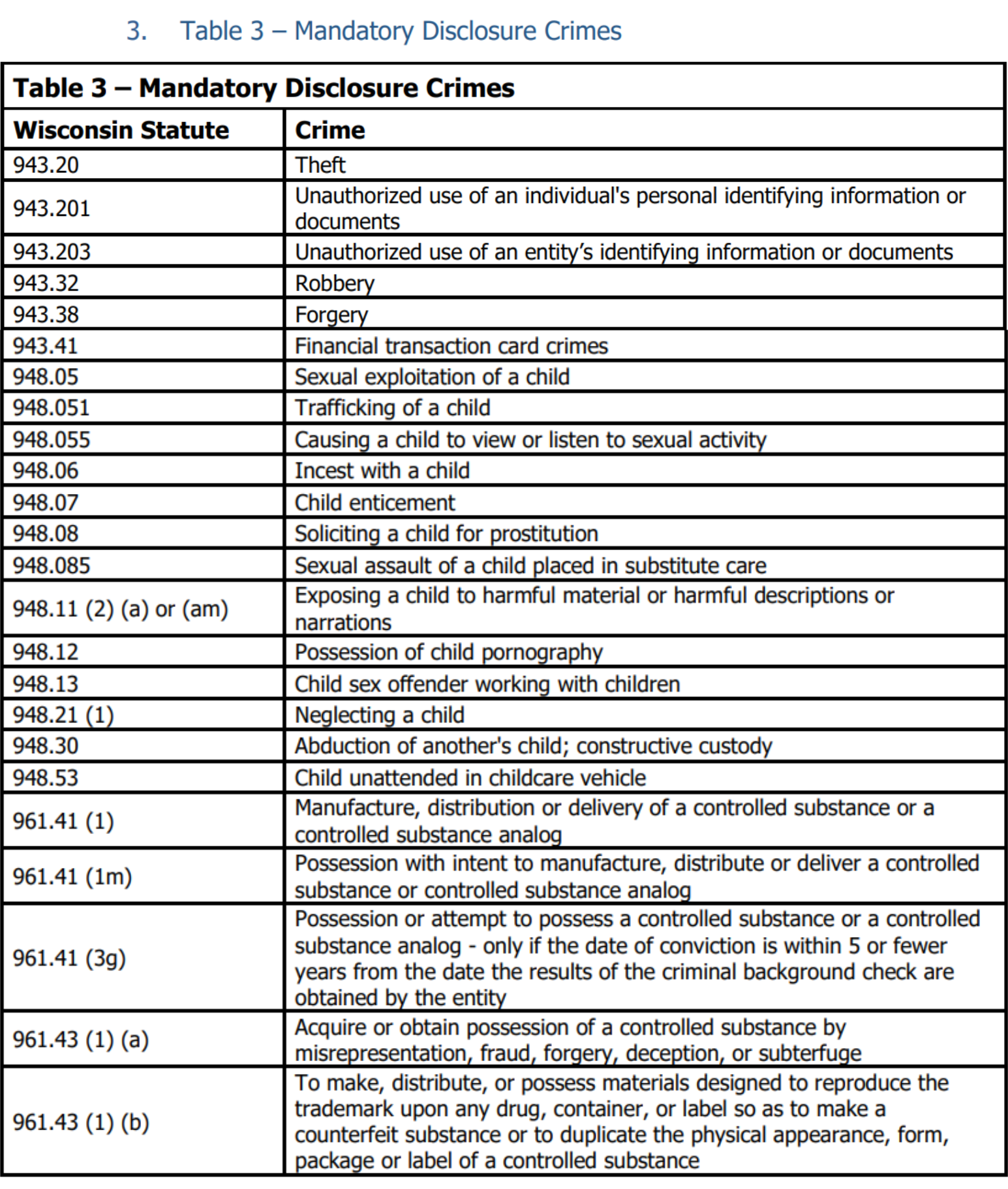 Table 3: Mandatory Disclosure Crimes will not determine the qualification status of the applicant or Participant-employed provider to receive Medicaid reimbursement for IRIS services. However, PremierFMS is required to report them to the Participant so the Participant can make an informed decision about who provides their care.