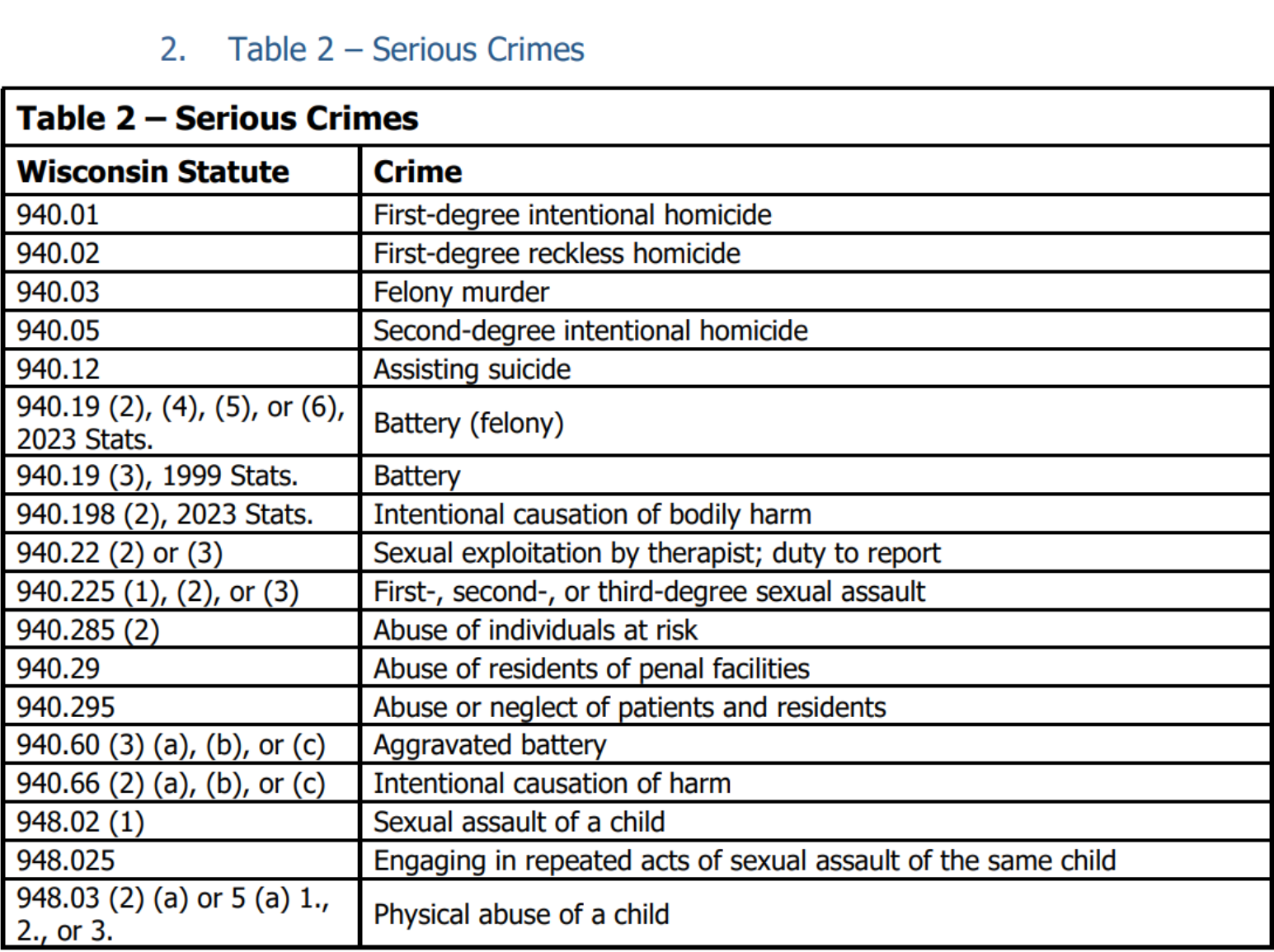 Table 2: Serious Crime convictions will disqualify an applicant or existing Participant-employer provider from receiving Medicaid reimbursement for IRIS services. Serious Crimes are appealable. The Participant may submit an appeal on behalf of the applicant or Participant-employer provider from DHS
